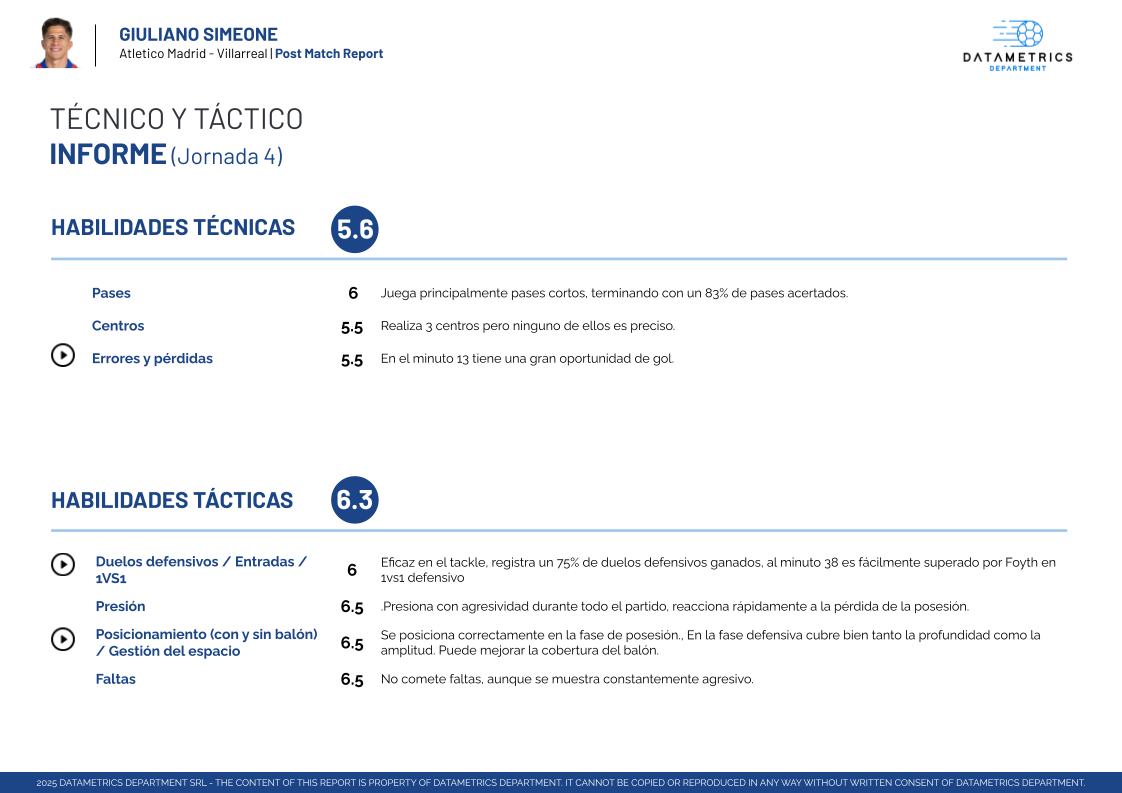 Report Post Match is designed for professional football players and provides personalized, objective, and external support for individual growth. Through a detailed performance analysis tailored to each player’s specific needs, it helps develop a deep awareness of one’s own game — highlighting both strengths and areas for improvement. A key component of the service is continuous benchmarking against other top players in the same position across the league, allowing a clear understanding of each player’s true performance level compared to the competitive standard. The goal is always the same: to help and support the player’s growth and career development, providing insights and guidance that translate analysis into real progress on the pitch.